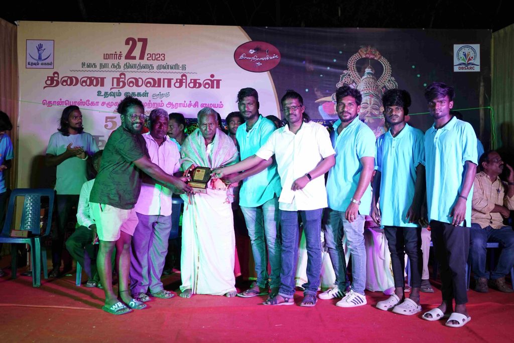 On March 27,2023, in celebration of World Theatre Day, “Thinainilavaasigal” organized the Kaatla Arts Festival, a grand tribute to the performing arts. Selecting a village in Tamil Nadu as the focal point, they identify veteran artists from the region and honor them with heartfelt tributes and monetary gifts. The festival also features an array of cultural performances, fostering an enriching exchange between seasoned and emerging artists. Through in-depth dialogues and interactions, the event raises awareness about the power and significance of theatre. For six consecutive years, this initiative has been successfully bringing communities together and igniting a passion for the dramatic arts.